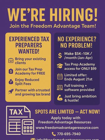 Join our team as a Tax Preparer and take advantage of comprehensive tax training, advanced tax software, and one-on-one coaching. This position offers a unique opportunity to leverage your skills and earn up to $10,000 a month. No prior experience is necessary, as we provide all the resources you need to succeed in this dynamic role.